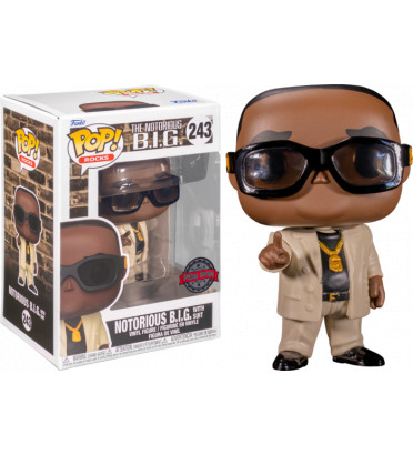 Notorious BIG, de son vrai nom Christopher Wallace, était un rappeur américain né à New York en 1972 et assassiné à Los Angeles en 1997. Il est considéré comme l'un des plus grands rappeurs de tous les temps, ayant beaucoup influencé ce genre musical. Funko l'a ici représenté avec un élégant costume beige qu'il porte avec de petites chaussures noires et une grosse chaîne en or. Il se tient avec un doigt en avant et il porte de grosses lunettes de soleil. Une très jolie figurine pour ce personnage culte.