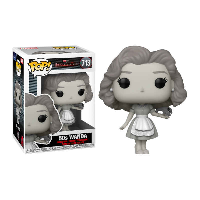 Wanda est l'un des personnages principaux de la série WandaVision. Après la mort de Vision qui lui a brisé le coeur, Wanda emménage dans une petite ville et créé toute une réalité autour d'elle, recréant l'ambiance rassurante des séries qu'elle regardait quand elle était enfant. Funko l'a ici représentée telle qu'on la voit dans l'épisode se déroulant dans une série des années 50. Elle est représentée en noir et blanc avec une petite robe évasée à partir de la taille et un tablier. Ses cheveux sont bouclés à la mode des années 50. Une superbe figurine à réunir avec celle de Vision.